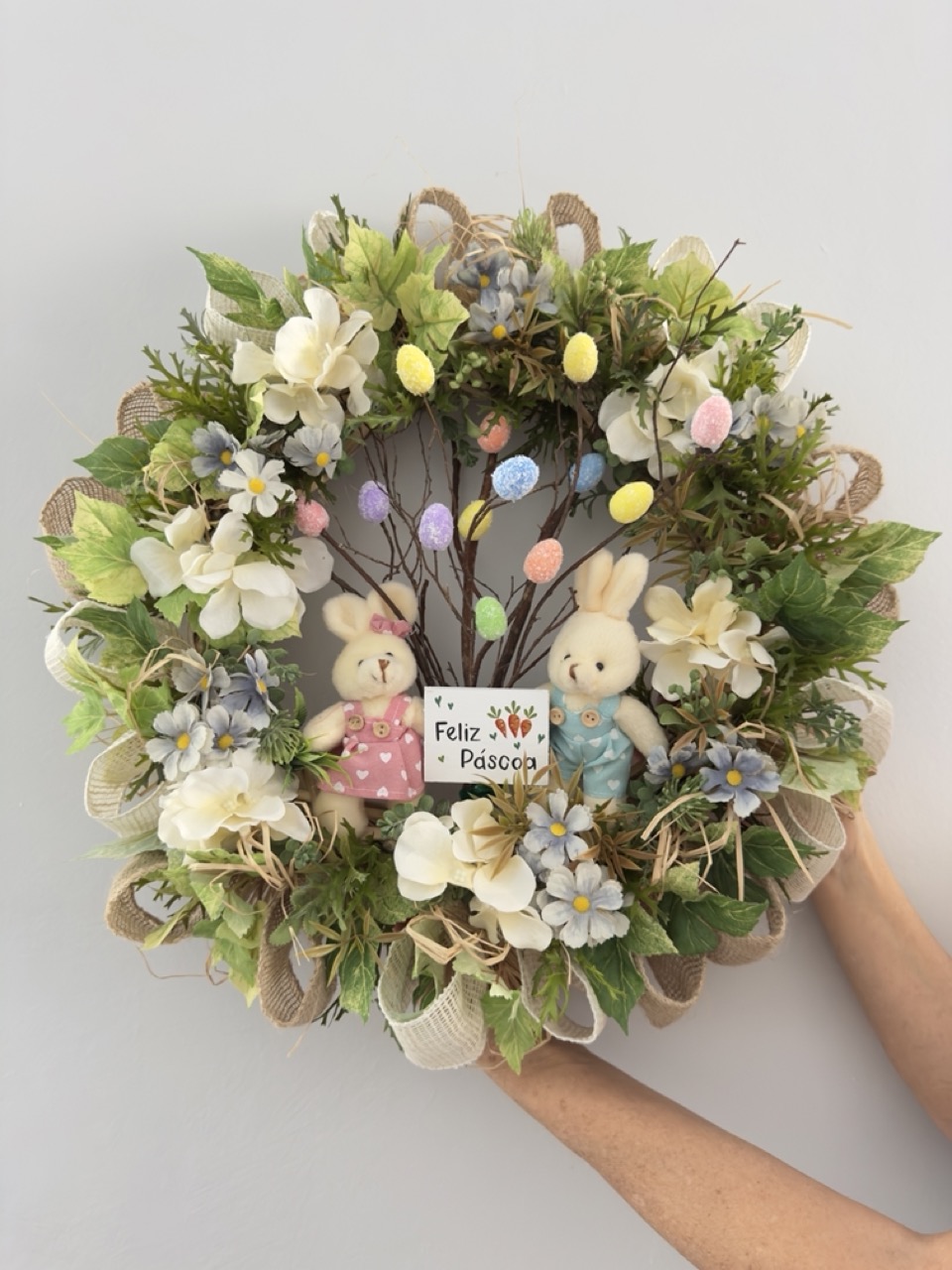 Guirlanda com a base de bambú, decorada com flores artificiais, laços, mini árvore natural com ovinhos de isopor, uma placa em madeira pintada e um casal de coelhos de pelúcia.