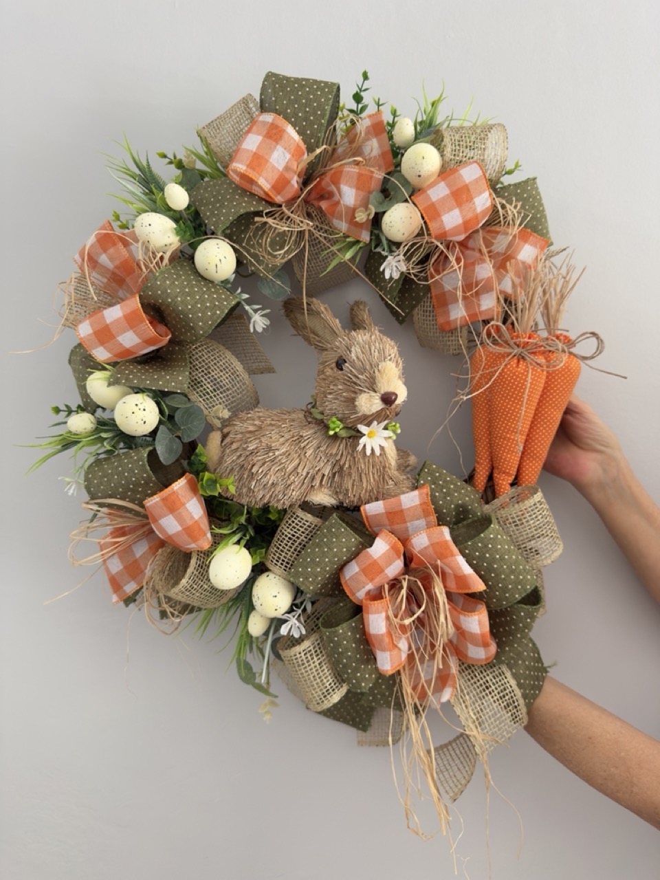 Guirlanda com a base de bambú, decorada com verdes artificiais, laços, ráfia, ovinhos de isopor, cenouras de tecido e um coelho de palha.