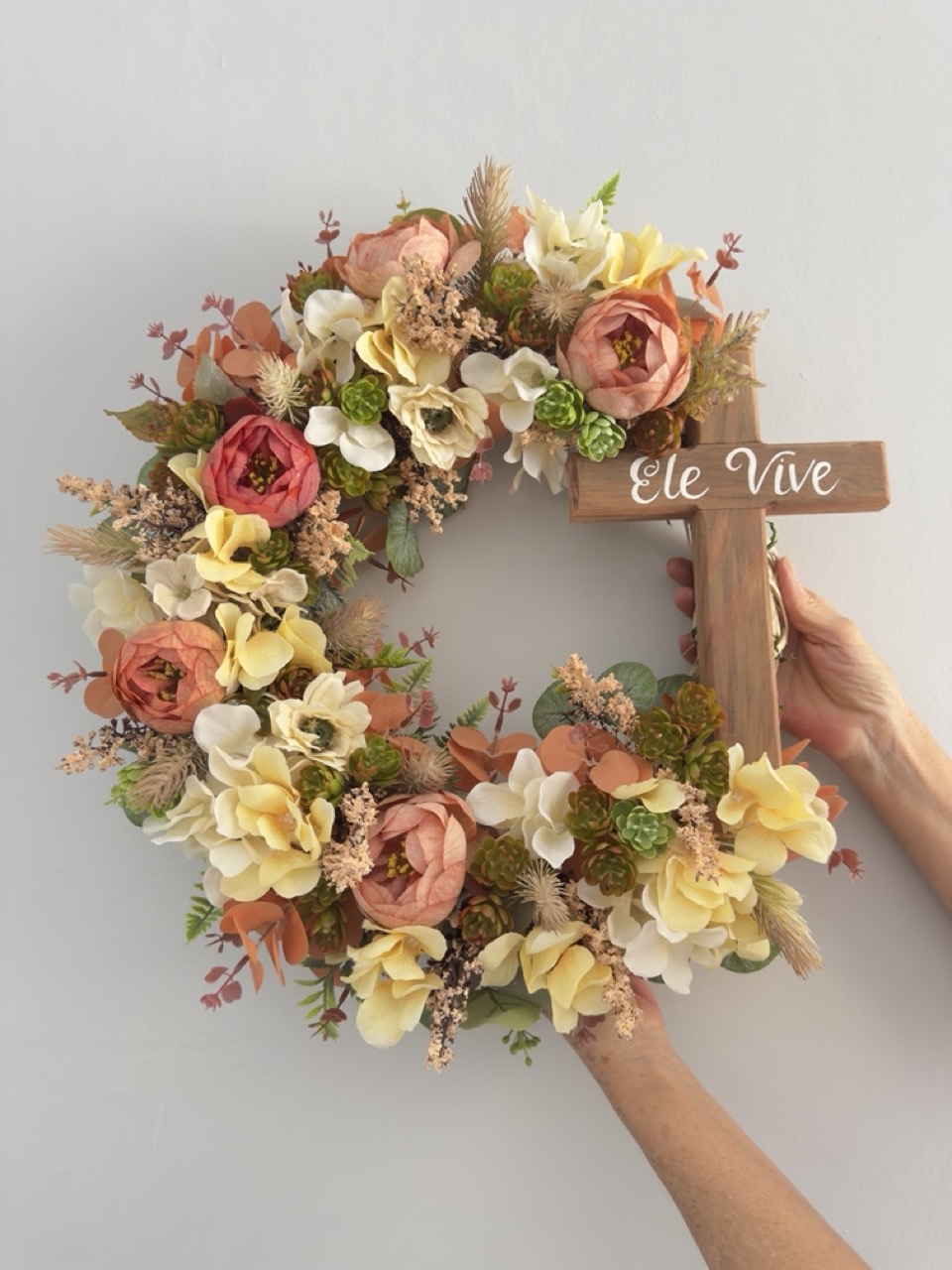 Guirlanda com a base de bambú, decorada com flores artificiais e uma cruz em madeira pintada.