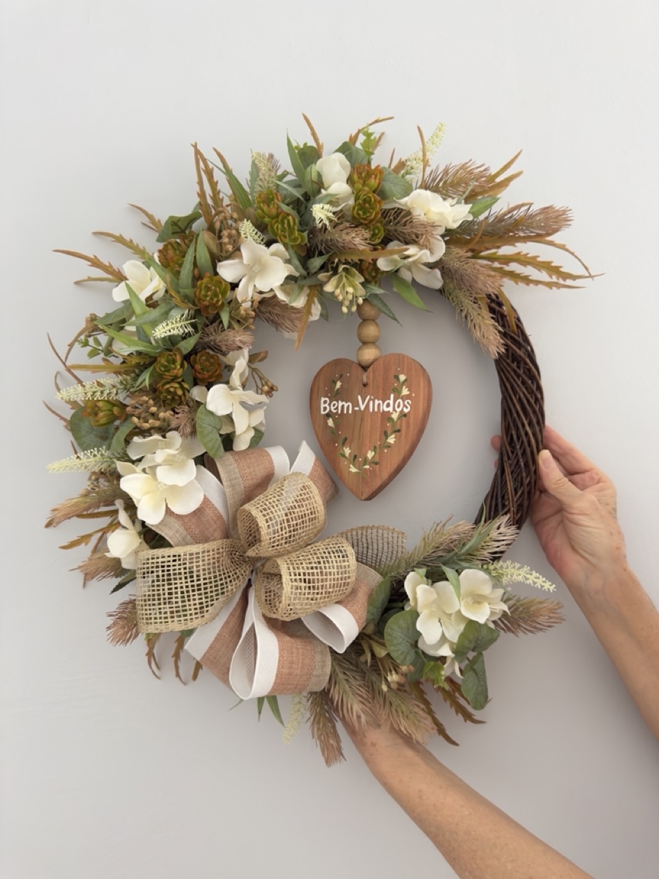 Guirlanda com a base de ratan, decorada com flores artificiais, laços e um coração em madeira.