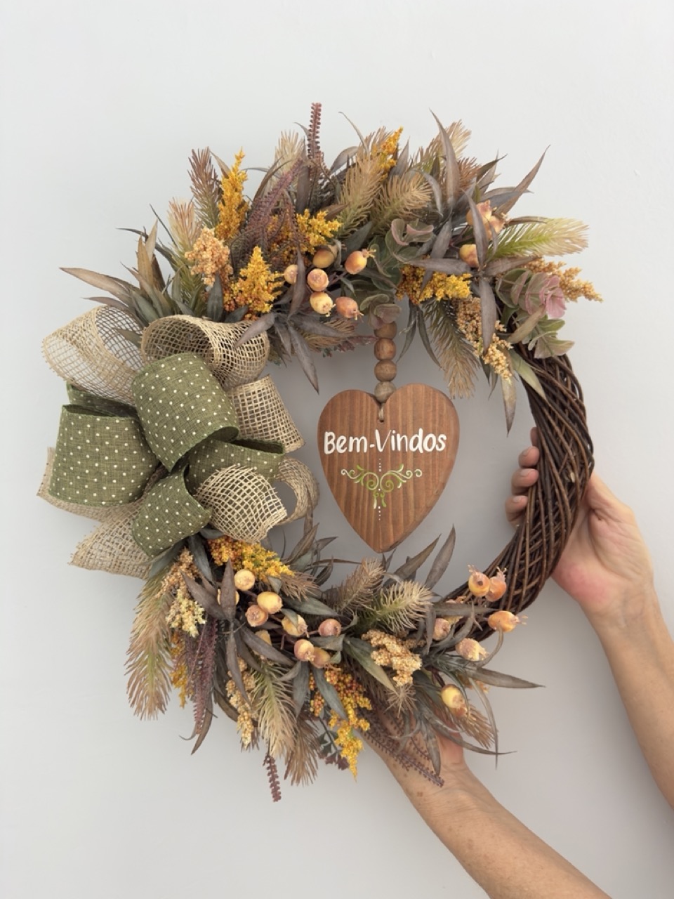 Guirlanda com a base de rattan, decorada com flores artificiais, laços e um coração de madeira pintado.