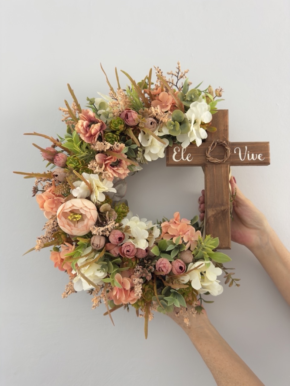Guirlanda com a base de bambú, decorada com flores artificiais e uma cruz em madeira pintada.