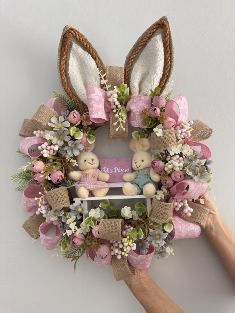 Guirlanda com a base de cipó, decorada com flores artificiais, picks, laços, orelhas em tecido, um banco e uma placa em madeira pintados, e um casal de coelhinhos de pelúcia.