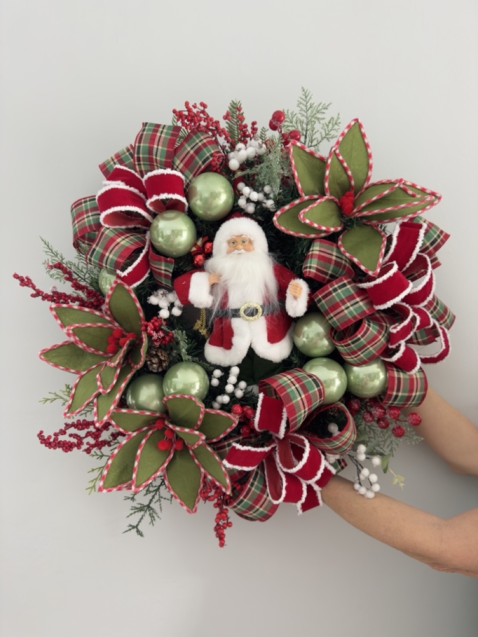 Guirlanda com a base de festão, decorada com verdes e flores artificiais, picks, bolas, laços e um papai noel.