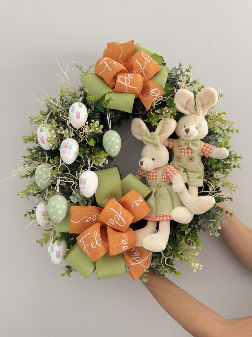 Guirlanda com a base de festão, decorada com verdes artificiais, laços, ovinhos de plástico e um casal de coelhinhos em pelúcia.