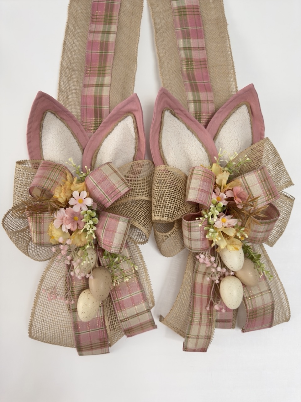 Escapulário com a base de fitas, decorado com orelhinhas de tecido, laços, picks e ovos de plástico. Possui os dois lados iguais.