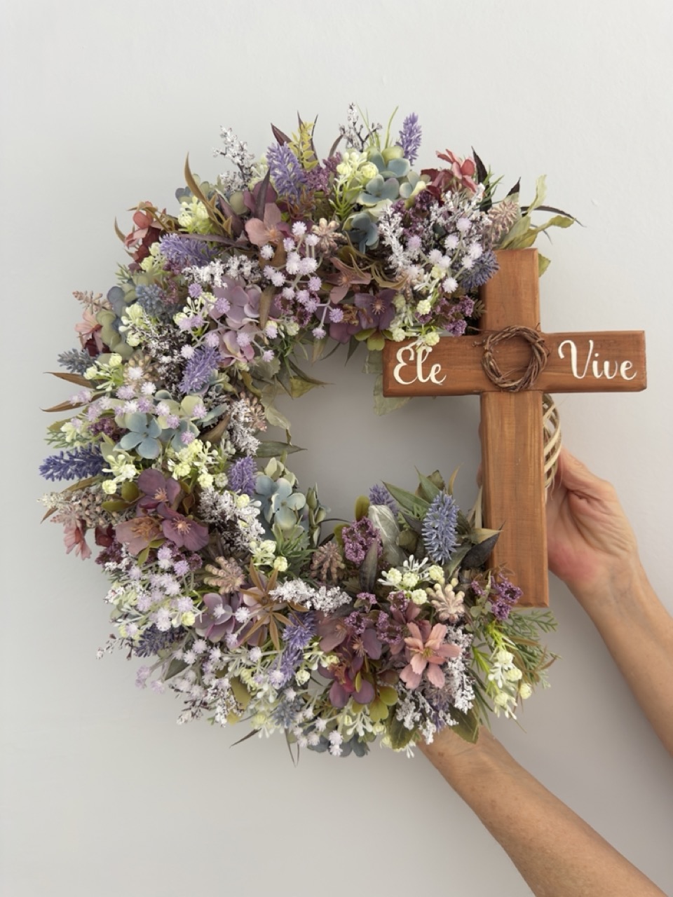 Guirlanda com a base de bambú, decorada com flores artificiais e uma cruz em madeira pintada.