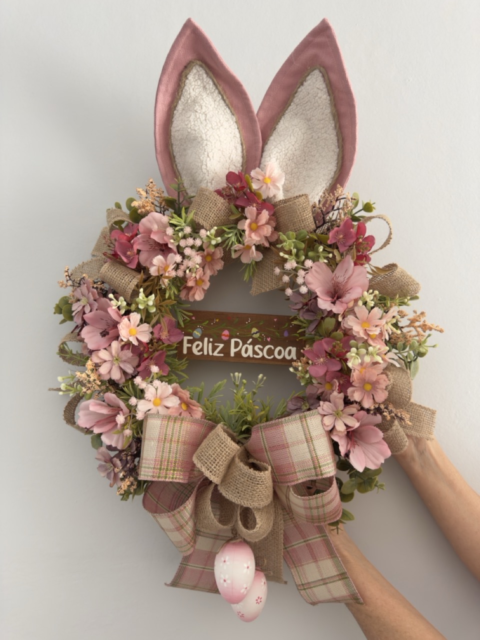 Guirlanda com a base de bambú, decorada com flores artificiais, laços, ovinhos de plástico, orelhas de tecido e uma placa de madeira pintada.