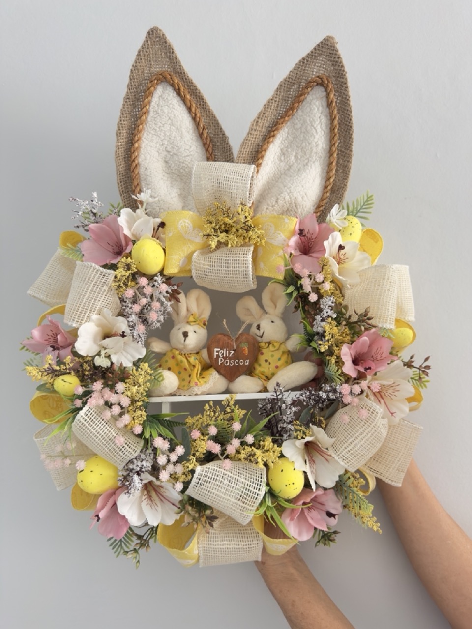 Guirlanda com a base de bambú, decorada com flores artificiais, picks, laços, orelhinhas de tecido, um banco e um coração de madeira pintados, e um casal de coelhinhos de pelúcia.