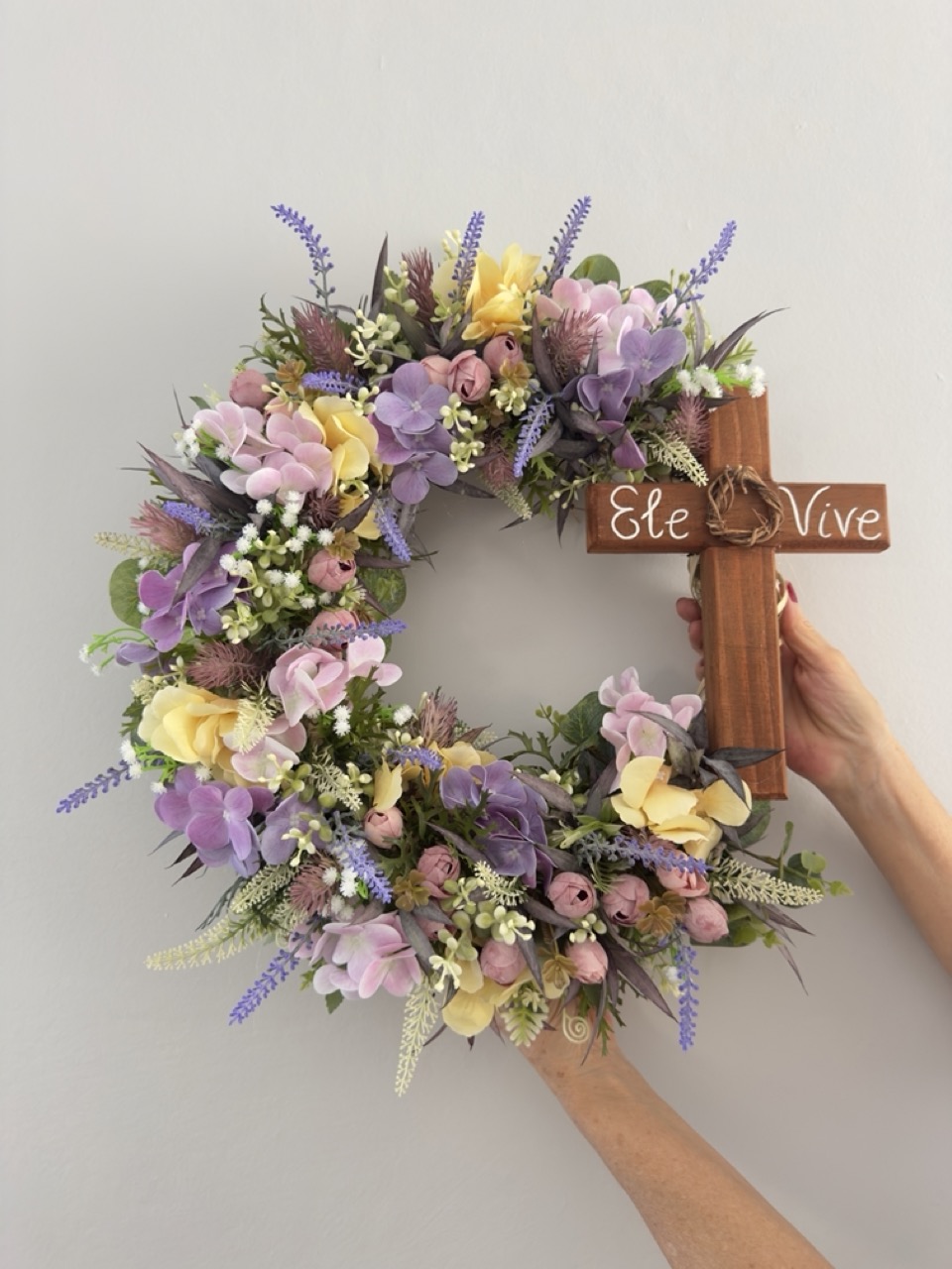 Guirlanda com a base de bambú, decorada com flores artificiais e uma cruz em madeira pintada.