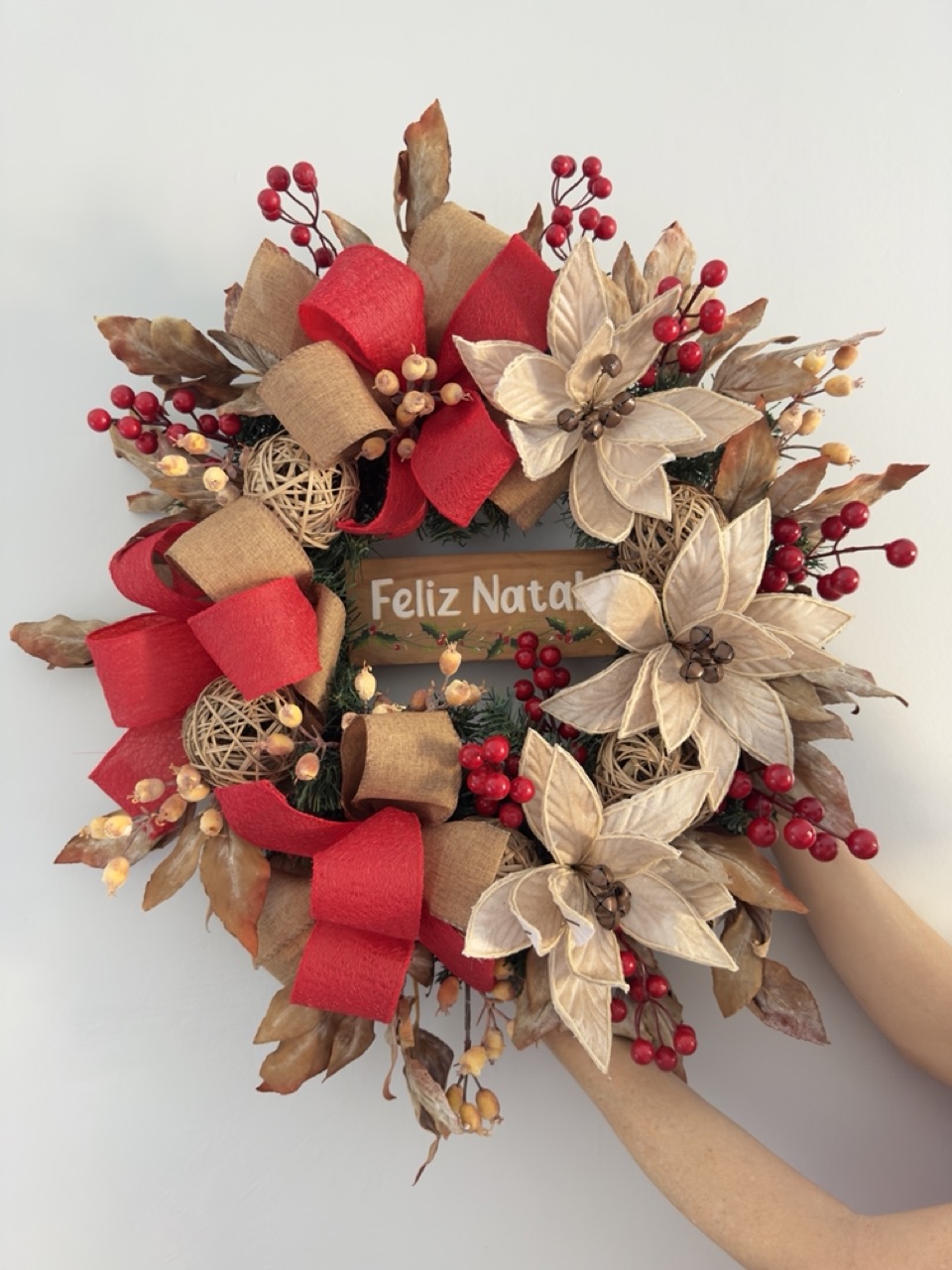 Guirlanda com a base de festão, decorada com flores artificiais, picks, bolas de bambú, laços e uma placa em madeira pintada.