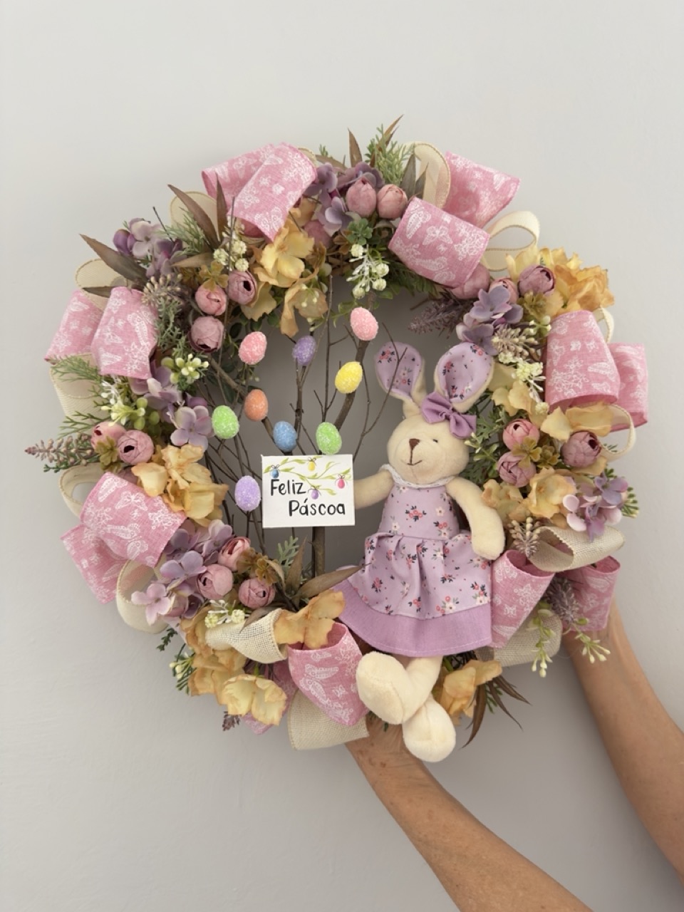 Guirlanda com a base de bambú, decorada com flores artificiais, laços, uma placa em madeira pintada, uma mini árvore de galhos naturais com ovinhos de isopor e uma coelha de tecido.