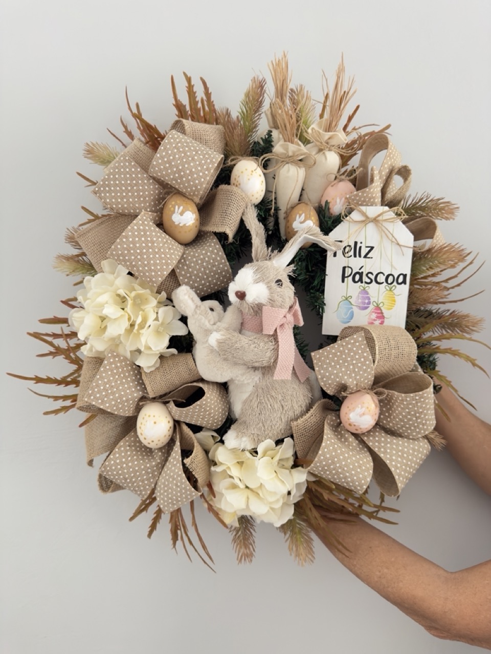 Guirlanda com a base de festão, decorada com flores artificiais, cenouras de tecido, laços, uma placa de madeira pintada, ovos naturais e uma coelha com filhote de palha.