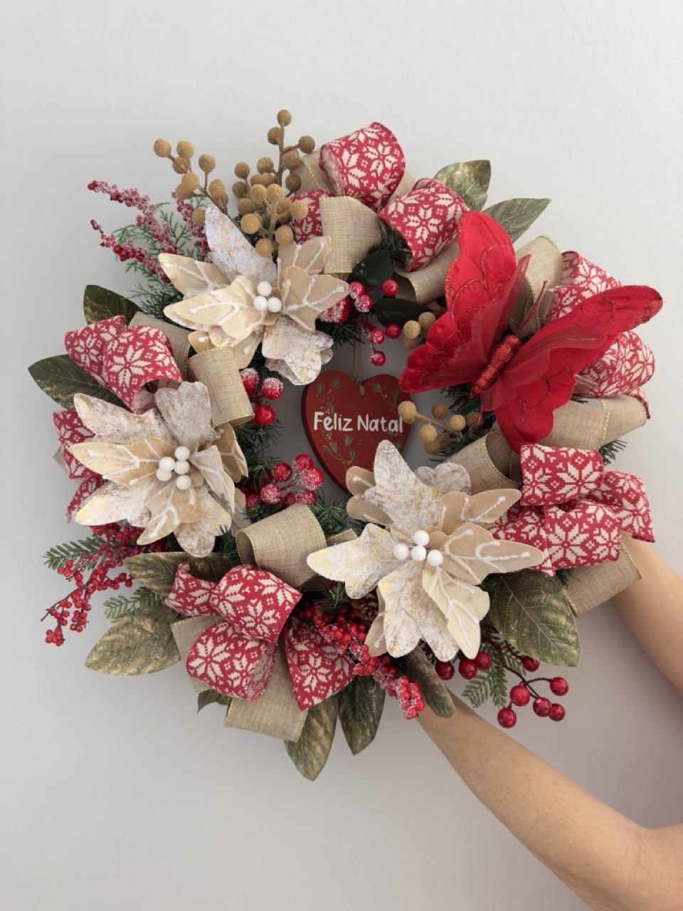 Guirlanda com a base de festão, decorada com verdes artificiais, picks, flores artificiais, borboleta, laços e um coração de madeira pintado.