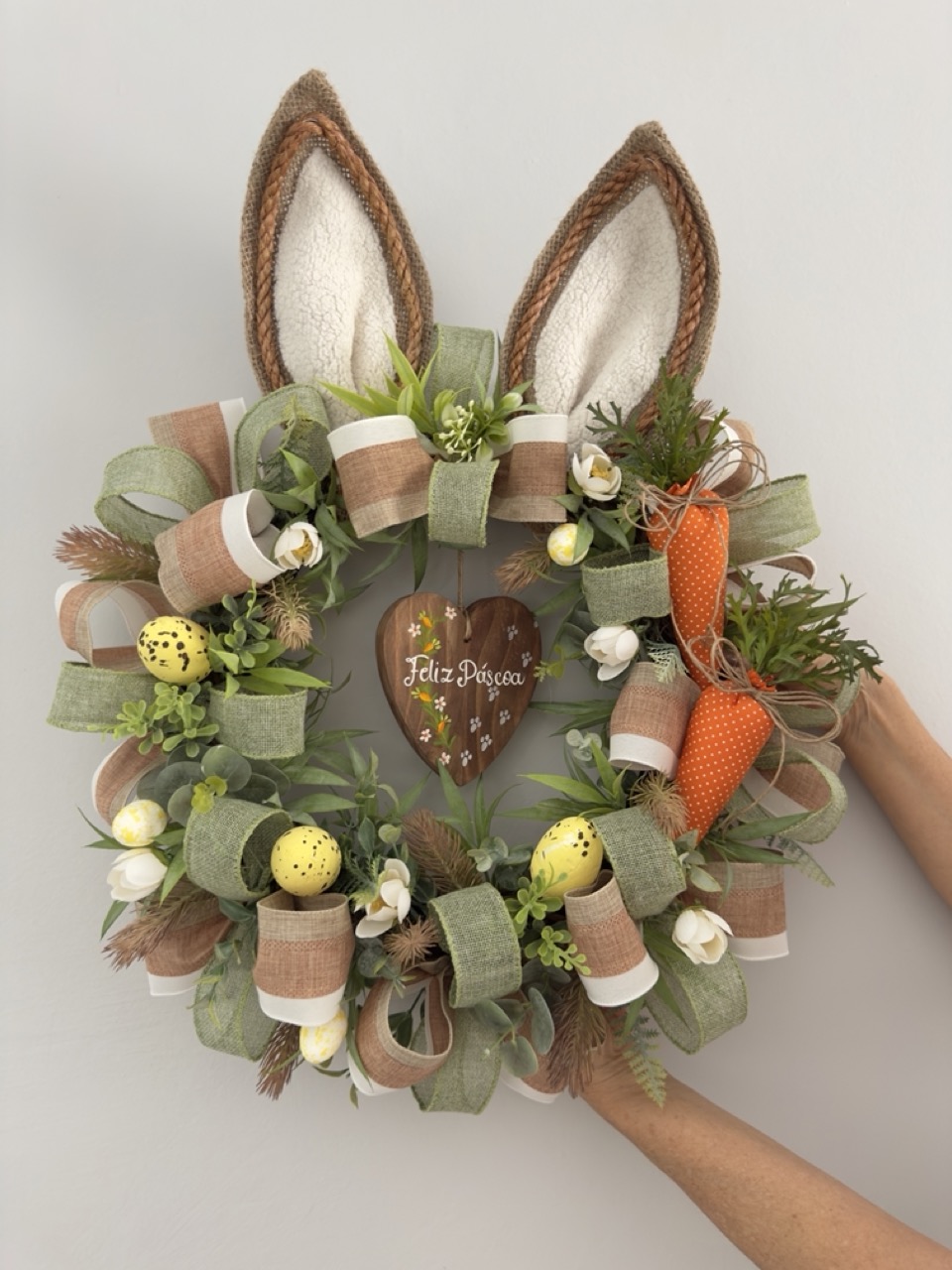 Guirlanda com a base de bambú, decorada com verdes artificiais, picks, laços, cenouras em tecido, orelhas em tecido e um coração em madeira pintado.