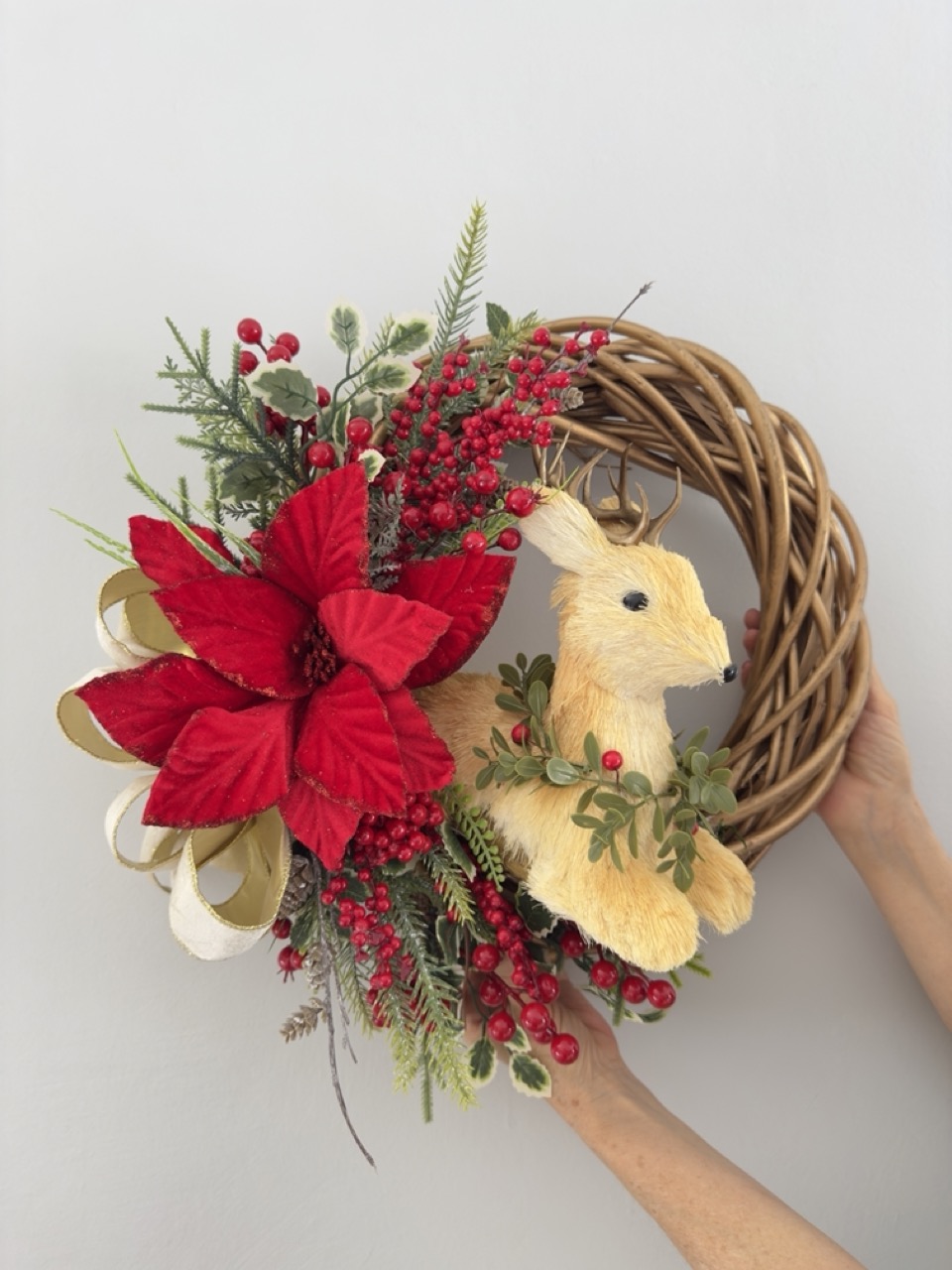 Guirlanda com a base de vime, decorada com flores artificiais, picks, laço e uma rena de palha.