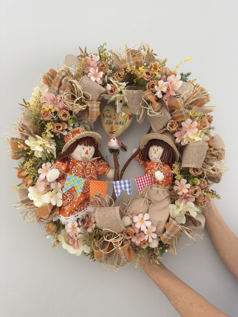 Guirlanda com a base de bambú, decorada com verdes e flores artificiais, laços, coração em madeira pintado, galho natural, mini passarinho, bandeirinhas de tecido e um casal de tecido.